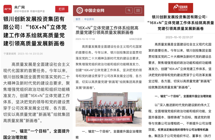 近日,央廣網(wǎng)、中國企業(yè)網(wǎng)、寧夏新聞網(wǎng)等主流媒體聚焦國企高質(zhì)量發(fā)展的生動(dòng)實(shí)踐,深度報(bào)道了銀川創(chuàng)投集團(tuán)黨的建設(shè)成果。
