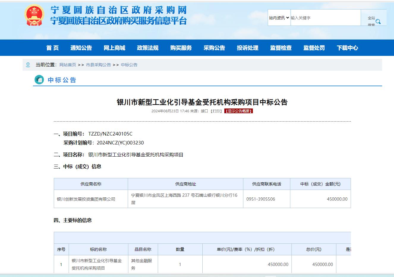 8月23日,銀川創(chuàng)投集團中標銀川市新型工業(yè)化引導基金受托機構采購項目。